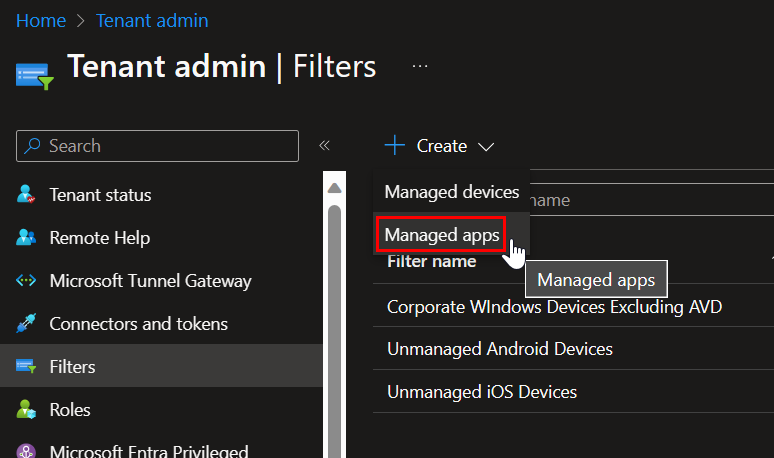 We’ll want to make a filter before we assign the new app protection policy. This is so we can specifically target unmanaged devices. If you’re following along, do this in a new tab, or finish your app protection policy but don’t assign it until you have the filter created. To create a filter, navigate to Tenant Administration > Filters. From the drop-down, we want to create a managed app filter.