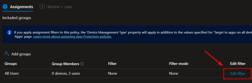 Once your filter is created, we can assign the app protection policy. Assign your policy to your target group and then click the Edit Filter link: