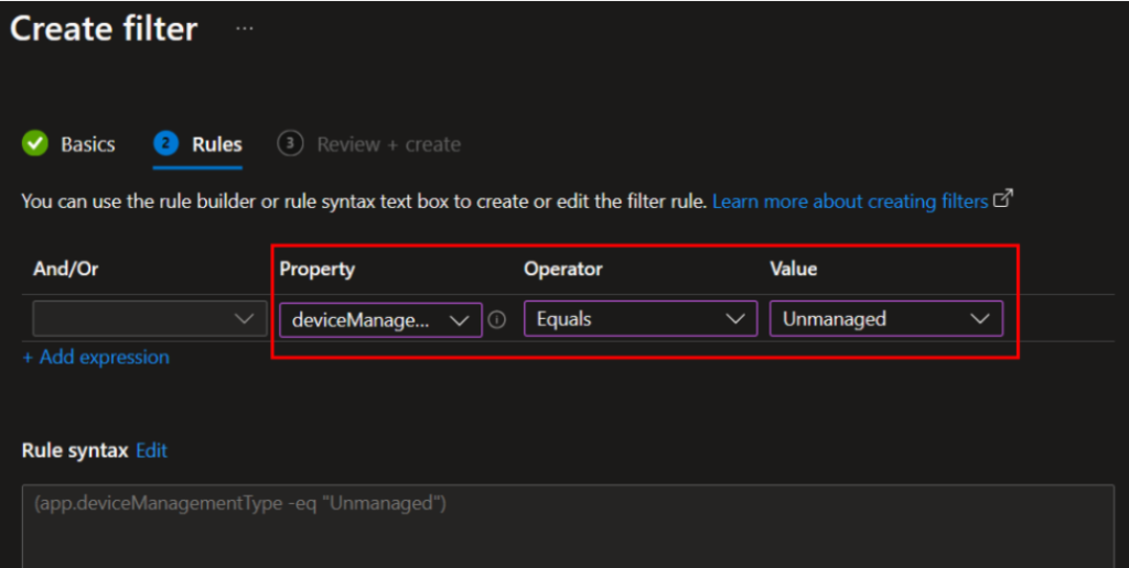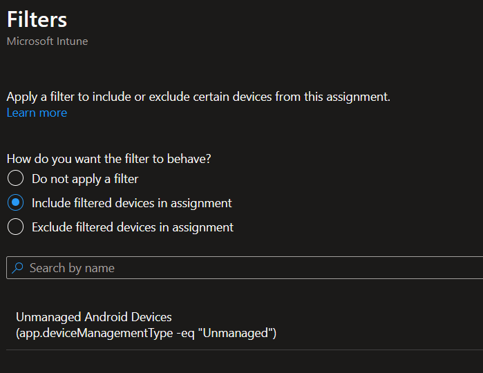 Select to include the filtered devices in the assignment and select your filter for unmanaged devices: