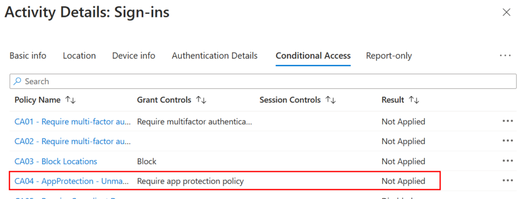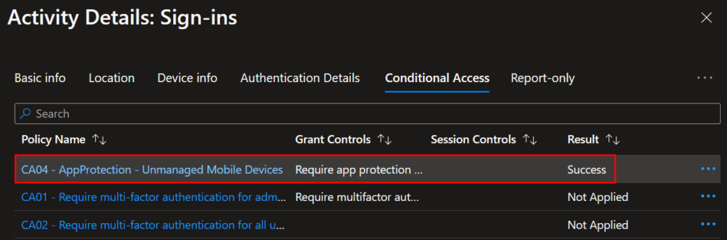 And the sign-in from an unmanaged device. Clicking the conditional access tab we can see the CA policy to require an app protection policy was successful. You can also look here for any CA policies showing failed if the user is having issues.