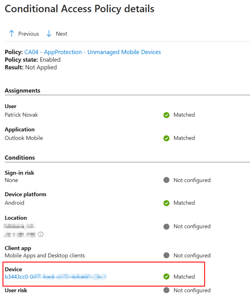 If we click on that CA policy from the sign-in logs, we can get more details and it will show us the device ID, and show us the device matched the filter, so it wasn’t applied: