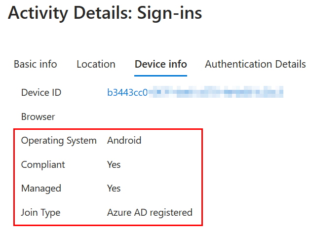 Here is the sign-in log from the managed device. We can see that the conditional access policy did not apply because the authentication came from a compliant managed device. We’ll see that the device type is managed and compliant from the device info tab:
