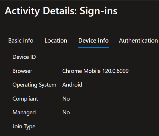 And the device information for this device shows that it is unmanaged, which applies to our conditional access policy filter.
