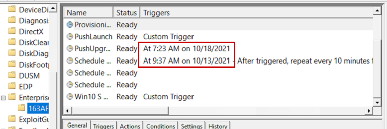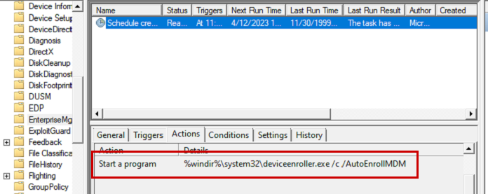 The breakdown is outlined below. First, the script identifies the enrollment GUID based on name of the scheduled task. Next, it deletes the scheduled task and the registry enrollment GUID key (and all subkeys). Then, it runs gpupdate /force. That’s where we end up at this screenshot, with the newly generated scheduled task to run the device enroller: