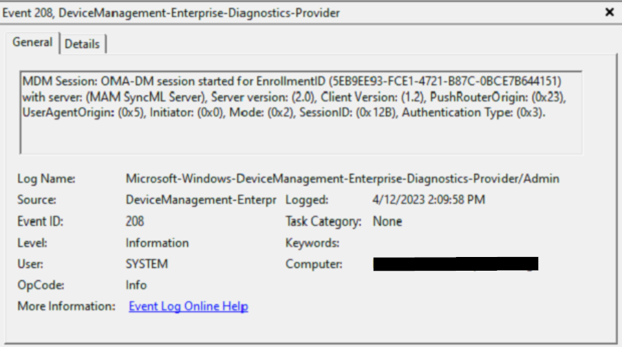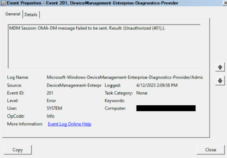 Right away I found some errors and interesting entries in the Device Management Admin log: