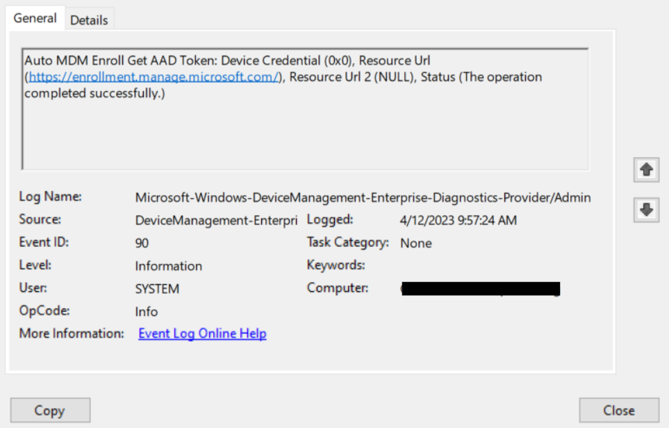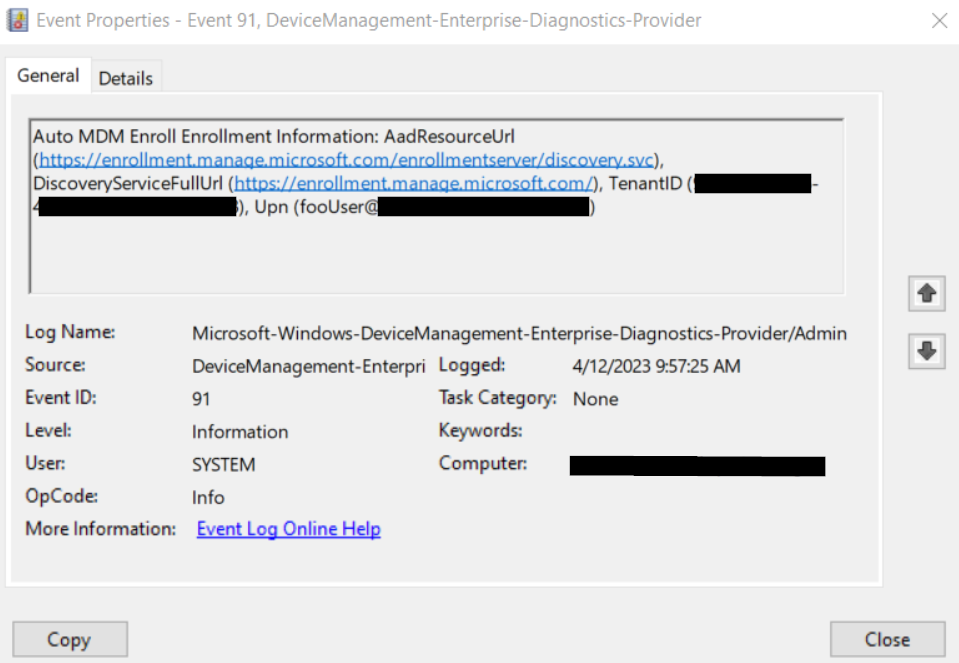 Devices were Hybrid joining properly, and dsregcmd /status confirmed that. So, I turned my attention to the enrollment logs, scheduled tasks, and registry entries for device enrollment. If you work in HAADJ Intune environments often (and unfortunately, I do), I suggest you read this Enroll a Windows 10 device automatically using Group Policy – Windows Client Management | Microsoft Learn.