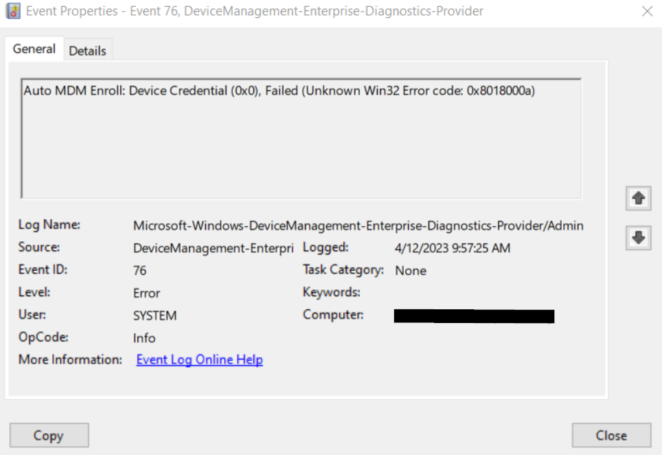 And this, which indicates the device is already enrolled (Diagnose MDM enrollment failures – Windows Client Management | Microsoft Learn).
