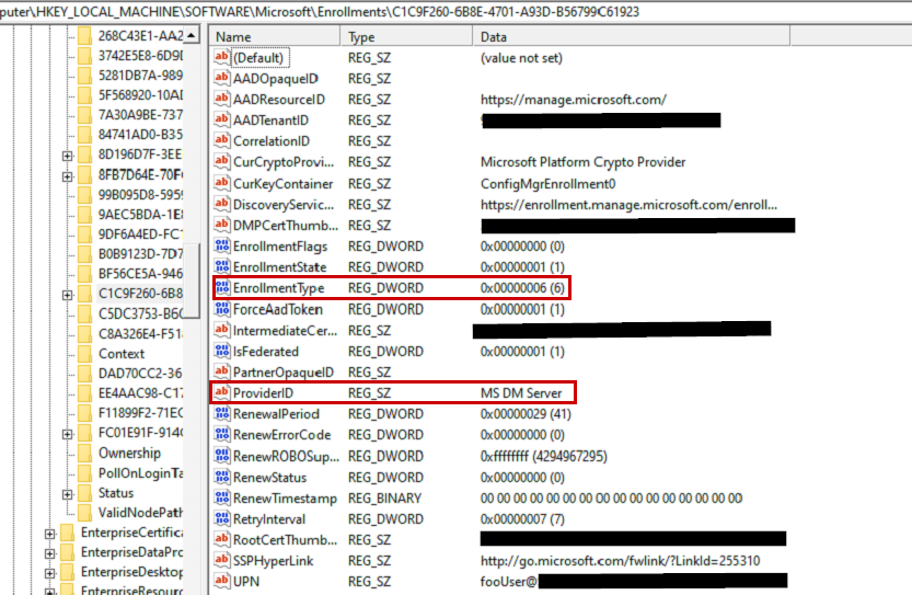 I highlighted the values that differ on the problematic machine, but the big problems are the AADResourceID, DiscoveryServiceFullURL, EnrollmentType, and ProviderID. Those values clearly indicate this device was previously enrolled in MAM and the enrollment was never cleaned up.