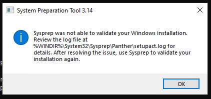 I recently ran into an issue with a client when trying to capture a new AVD image. When trying to sysprep the VM before image capture, we were receiving the below error – “Sysprep was not able to validate your Windows Installation. Review the log file at %WINDIR%\System32\Sysprep\Panther\setupact.log”