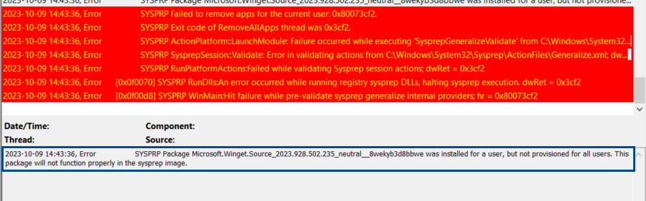 The above error on its own is not very helpful, but if we open the referenced log file, we can see several errors. Specifically, can can see it’s complaining about the Microsoft.Winget.Source app being installed for a user, but not provisioned for all users and this package won’t function properly in a sysprep image.