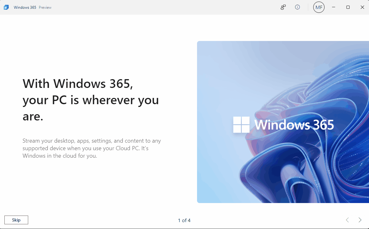 Next, I need to see if I can skip this if a different user signs in to the App. I was skeptical of this since part of the Account ID is located in the .log file. This time, I follow the same process, but sign in with a different user account to the Windows 365 app. This also successfully skips the first run experience: