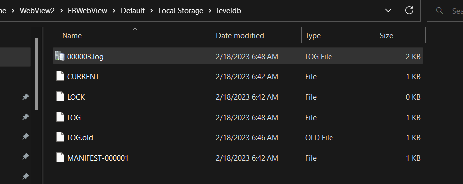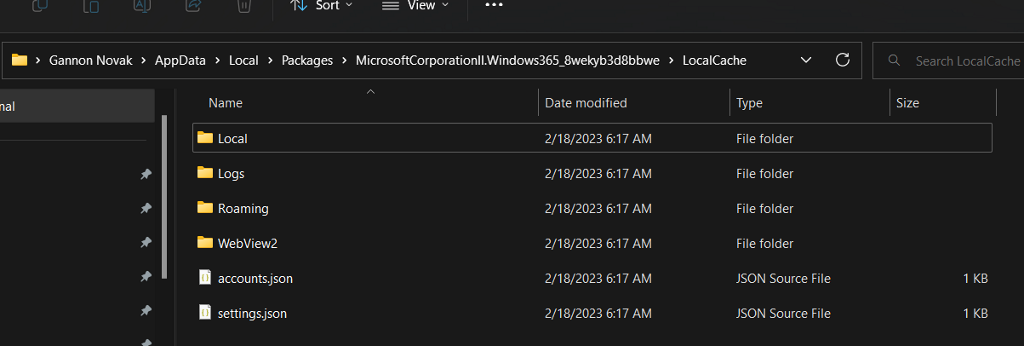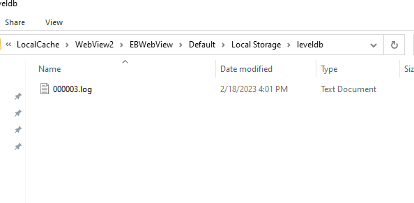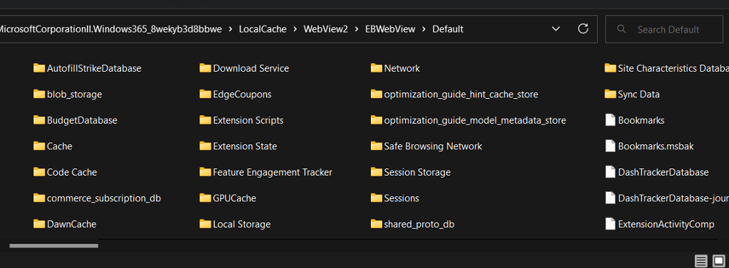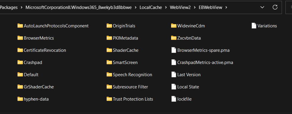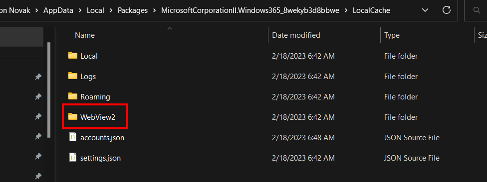 Now that we have our directory, we needed to determine the file or files that contain this data. I started opening files with recognizable file formats and looking through the folders. On first thought, the accounts and settings.json looked interesting. The accounts.json file contains the user data that authenticated to the app. Deleting that file will force you re-authenticate the next time the app is launched. Settings.json contained no additional interesting data. There was too much to manually go through, so I started deleting child folders to find which child folder would give me the result I wanted. The WebView2 folder was the culprit, so I opened that to take a closer look: