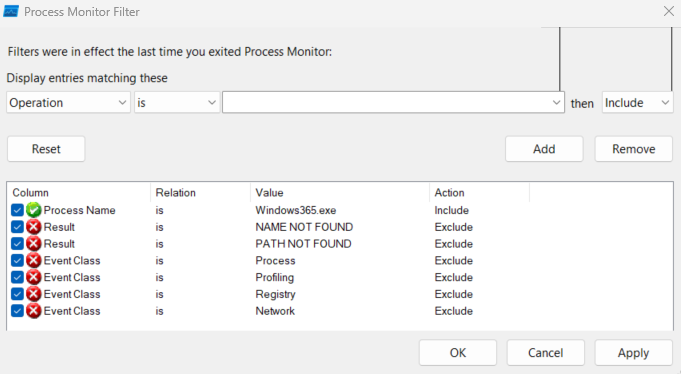 Next, I fired up procmon to see what is happening after the first run experience is complete. Procmon can be messy since there is so much going on, so I recommend you learn how to use the filters. Even with filters, there can still be a lot to go through, but you can narrow your results easily by adding additional filters to the results. Since I already ruled the registry out, I filtered registry items along with some others and focused the results of the Windows365.exe process name.