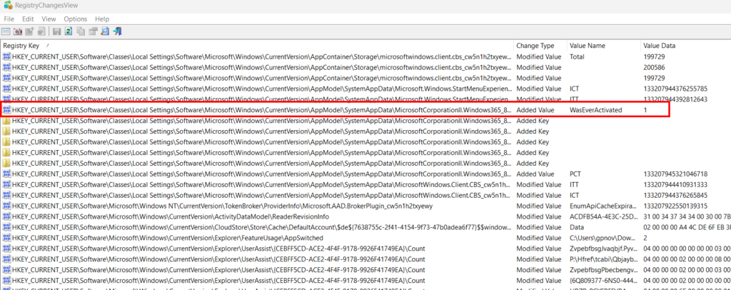 With most Windows-based apps, I figured this was probably a registry key that gets flipped. That should be easy enough to track down. I’ve covered this in previous blogs, but my tool of choice to find before and after registry changes is RegistryChangesView by Nirsoft. We can take a snapshot of all reg hive keys before doing something, and then grab a snapshot after doing something. This will show us any added keys and any changed values. So, I grabbed a snapshot after installing the Windows 365 Preview App, and then grabbed another snapshot after going through the first run experience. Not much happened, but initially, I thought I found the value I needed on my first try. A value name of “WasEverActivated” was created with a value of 1. See below: