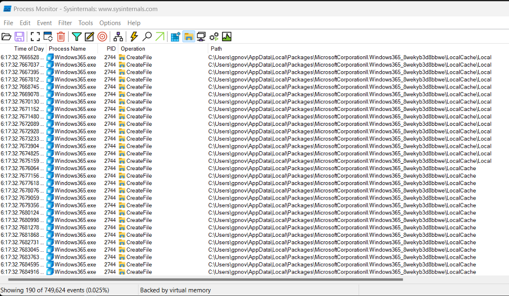 Next, I installed the Windows 365 application while letting procmon run, and proceeded through the first start pages. That still resulted in 11,000+ file system events. I started skimming through the events to see if anything looked interesting. There were some files and folders created in the %localappdata% data directory for the signed-in user account that looked interesting. I narrowed my filter to CreateFile to I could see what was being created and where. This brought the results down to 1900, but the %localappdata%\Packages\MicrosoftCorporationII.Windows365_8wekyb3d8bbwe looked particularly interesting, so I applied one more filter for anything created with that file path. This brought my results down to 190: