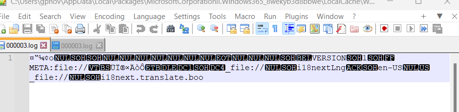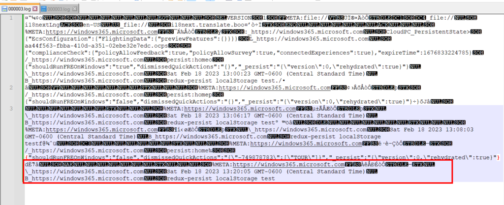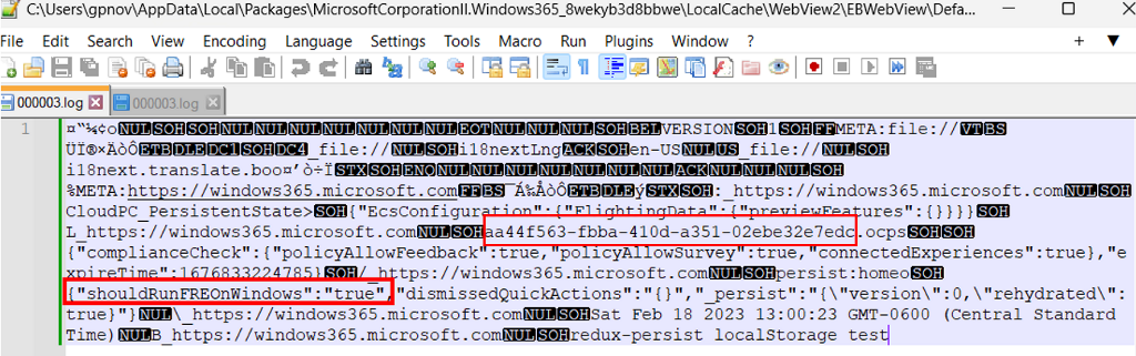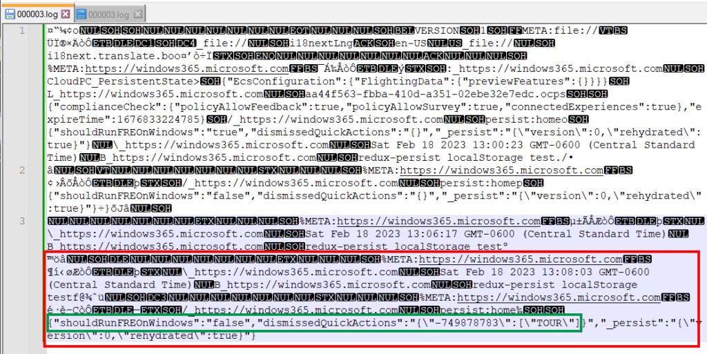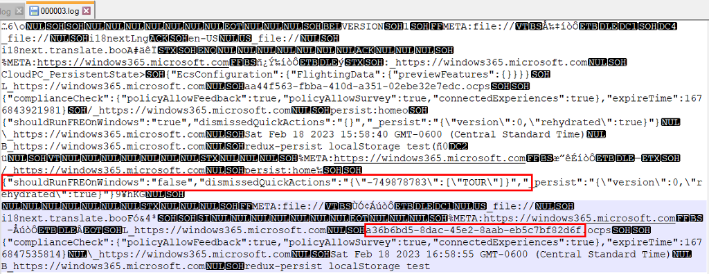 After some more process of elimination, the file I’ve been looking for is the 000003.log file. Let’s pop it open and look at it. This is not a traditional log file we expect with a .log extension. It looks like this contains some metadata for the connection to Windows 365. There are some interesting entries in here. I’m not certain if “FRE” pertains to “First Run Experience”, but I am assuming it does. This is the file AFTER I already proceeded through the first run experience: