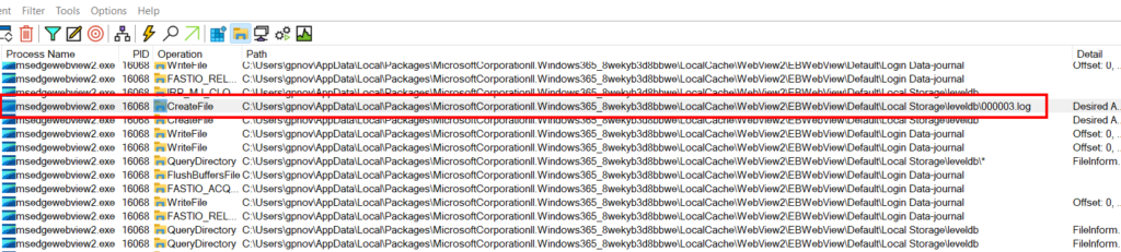 The other interesting thing here is the Windows365 process is not creating or writing to this file. It creates the top level LocalCache folder at %localappdata%\Packages\MicrosoftCorporationII.Windows365_8wekyb3d8bbwe\LocalCache, which we identified with Procmon. But a different process is creating the sub-directories and files. If we delete everything under the LocalCache folder, and then re-launch the Windows 365 app while monitoring that location with ProcMon, we can identify that the Windows365 app is calling on the msedgewebview2.exe process, which creates a slew of additional files, including our 000003.log file: