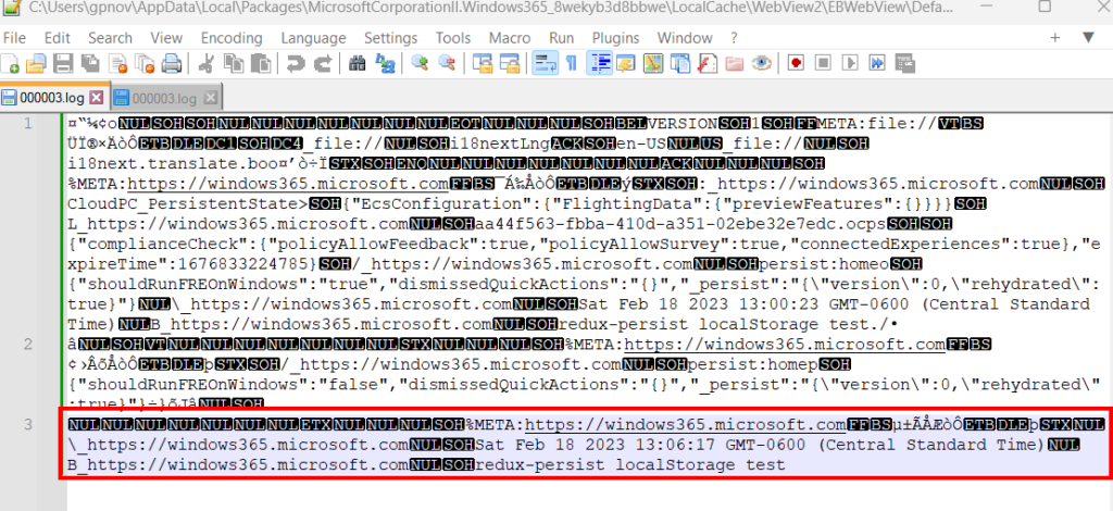 Per Microsoft (Introduction to Microsoft Edge WebView2 – Microsoft Edge Development | Microsoft Learn), MSEdgewebview2 allows you to embed web technology into apps. Essentially, this is using Edge to display web content in Windows 365 application. So, the first run experience, along with a bunch of other content is really not part of the app code, but displaying web content via the msedgewebview2 process. It seems the metadata and other contents contained in the 000003.log file determine which web content is shown to the user. Let’s do more testing. This time, I removed the application and then reinstalled it. I want to see what the 000003.log file looks like before finishing the first run experience, and what gets added when as we progress through: