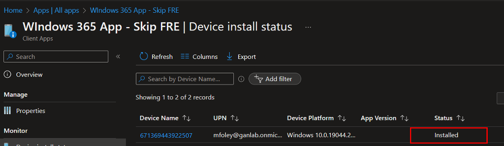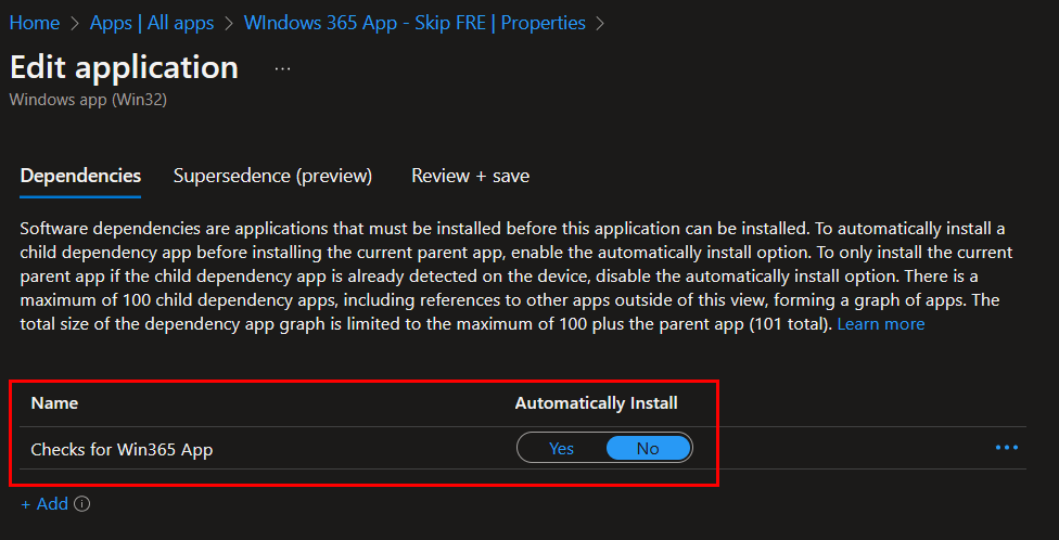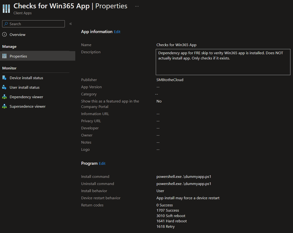 And we also make this app dependent on our previous Win32 app that simply checks to see if the Windows 365 app is installed: