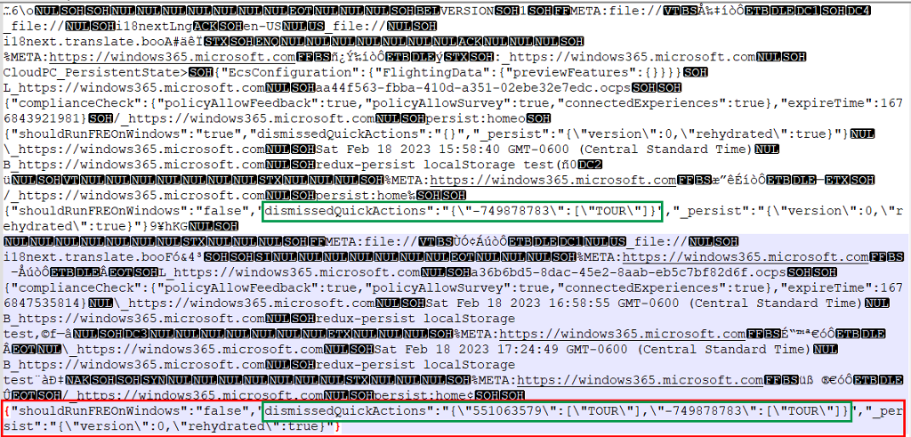 Here is the file I am going to use. I simply installed the Windows365 app on a device, signed in, went through the FRE, and closed the tour tile. Notice the FRE is set to “false” and there is data after dismissedQuickActions after closing that tile.