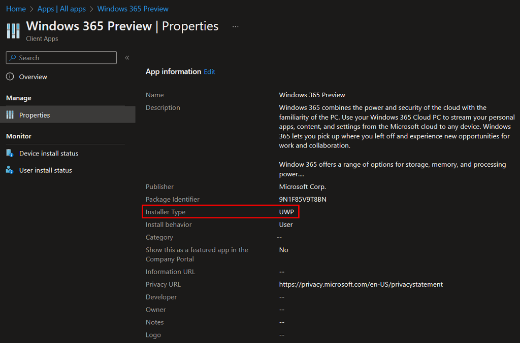 First, Deploy the Windows 365 Preview app using the Microsoft Store App (New) deployment method. You’ll see this is a UWP installer. So, we can’t make a win32app dependent on this application type.