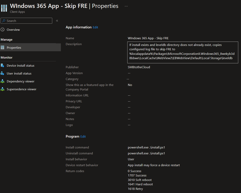Next, we need to make a dummy Win32app that simply checks to see if the Windows 365 app is installed. I say it’s a dummy app because its only purpose is to detect the installation of the Windows 365 application. This will allow us to make our real Win32 app dependent on this one, which ends up creating the %localappdata%\Packages\MicrosoftCorporationII.Windows365_8wekyb3d8bbwe\LocalCache\WebView2\EBWebView\Default\Local Storage\leveldb directory and copies our 000003.log file to that location.