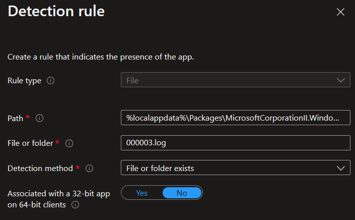 For our detection rule, we are using a simple file detection rule to see if the 000003.log file exists in %localappdata%\Packages\MicrosoftCorporationII.Windows365_8wekyb3d8bbwe\LocalCache\WebView2\EBWebView\Default\Local Storage\leveldb\. We do this because if that file already exists, we are assuming this app has already been launched and someone has skipped the first run experience already. Ideally, if we autopilot our machine, the Windows 365 app will be installed, our dummy detection Win32 app will detect its installed, and this app will create the necessary directory to house the 000003.log file, so it exists before the user launches the application for the first time.