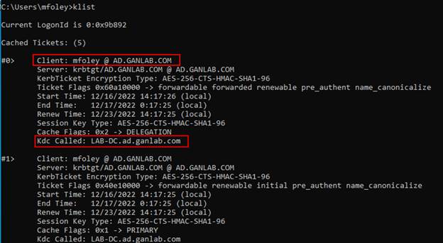 And here we can see The Kerberos tickets issued for mfoley and that they were issues from my Lab DC just like a typical AD joined machine.