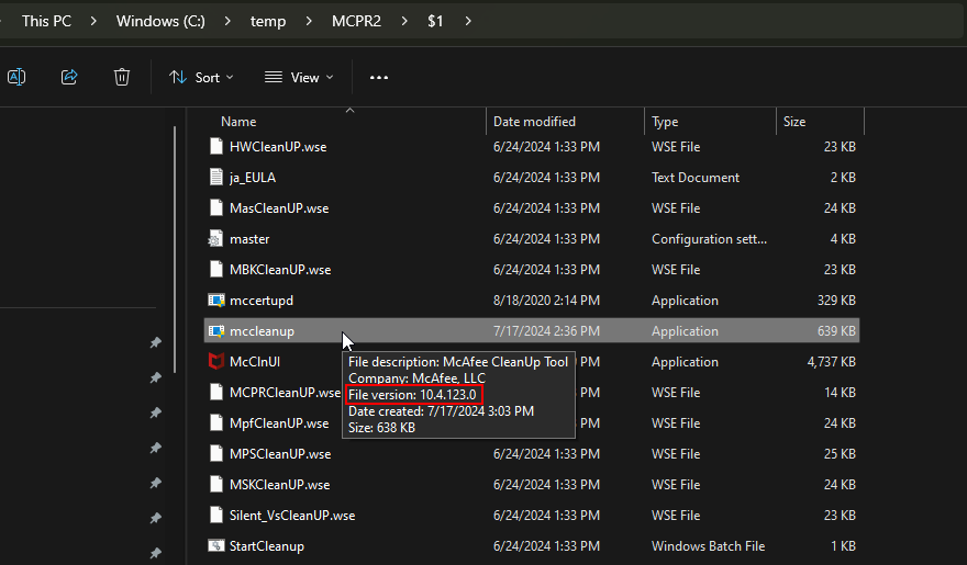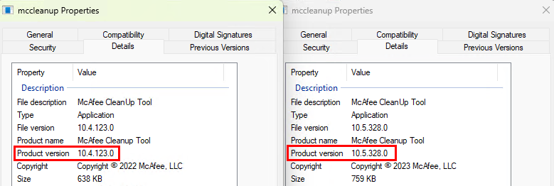 After seeing this, I did some more digging through my OneDrive and found an old version of the McAfee Consumer Product Removal tool (MCPR) from 2022. After extracting it, I compared the versions of mccleanup.exe, which is the program used when executing MCPR from the command line. The old version I had buried in my OneDrive is 10.4.123.0. The current version at the time of writing that can be downloaded from the McAfee site is 10.5.328.0.