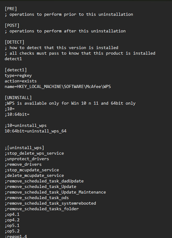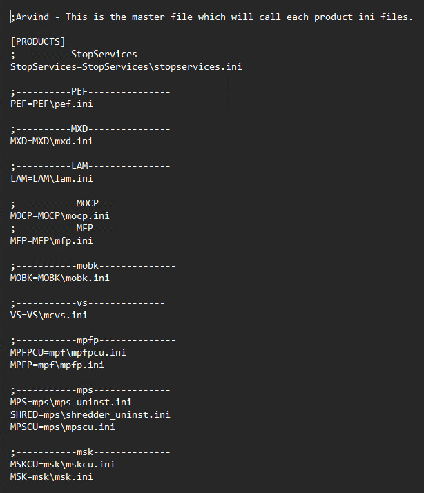 As new products are added for the cleanup utility, subfolders are added. When I compared the old to the new version, I only found one new folder – WPS. If we look at the master.ini file, which is also in the $1 directory, we will see it’s really just telling the removal tool to cycle through each of those subfolders, and reference the configuration file in each of those subfolders for instructions on how to remove the product: