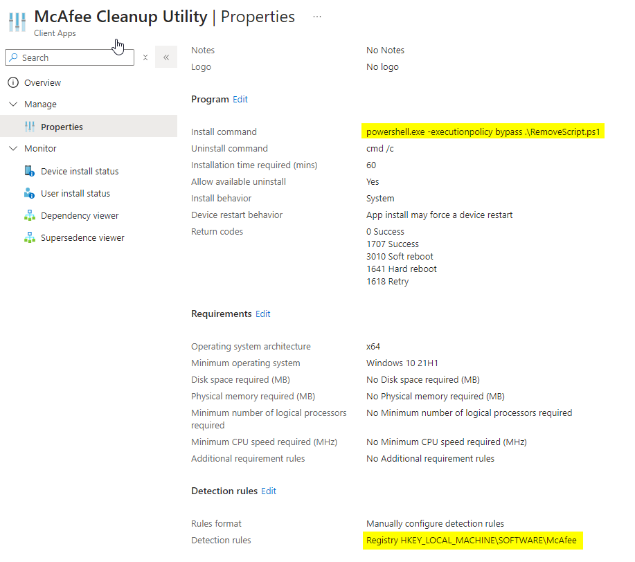 There are a couple of blogs out there regarding removing McAfee products with Intune. Those solutions have always worked for me in the past, until recently. Specifically, this post by Mr Tbone. It walks through the removal process using the McAfee Consumer Product Removal tool (MCPR) with a PowerShell script and a Win32 app. As I mentioned already, I’ve used this solution in the past successfully. For the first time in a while, I encountered a client who needed McAfee Security removed from around half of their devices.