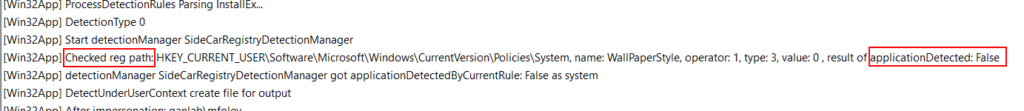 Next, you can manually look at the log entries coming after your app. In this example, I am looking for a reg value. You’ll want to look for entries starting with “Got Reg Value” and “Checked Reg Path” to see if those show as detected. File rules are similar and you want to look for “checked under path:”, and MSI detection rules start with “Checked ProductCode”. You can also search directly for those phrases and sort through your log until you find anywhere you suspect they failed. Additionally, you can search for “applicationdetected: false” to look for failed detection entries. You can then sort through the detection rules for your app to determine which individual rule is failing.