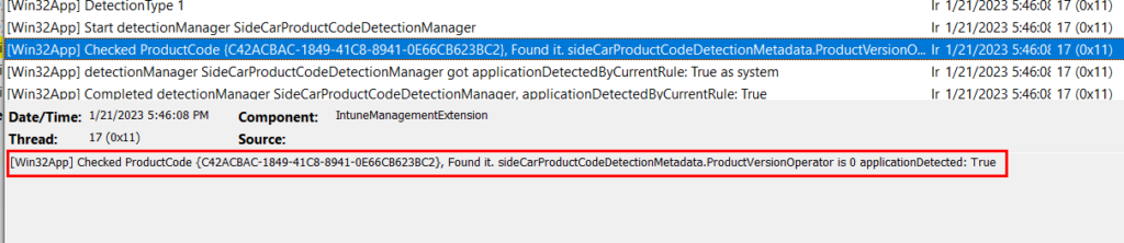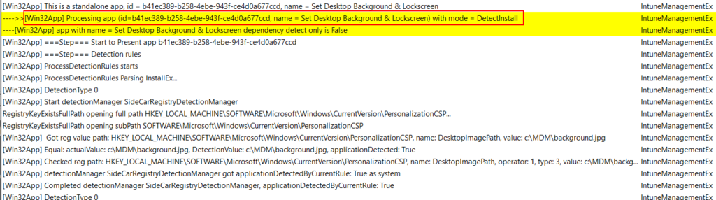 There are a few shortcuts you can use to quickly find your detection rule details in the IME log. You can search for “[Win32App] Processing App” and scroll through the results until you find your app, or you can search by your app’s name, everything after the entry starting with “[Win32App] Processing app” will contain details on the installation and detection. This will get you to the proper starting point in the log: