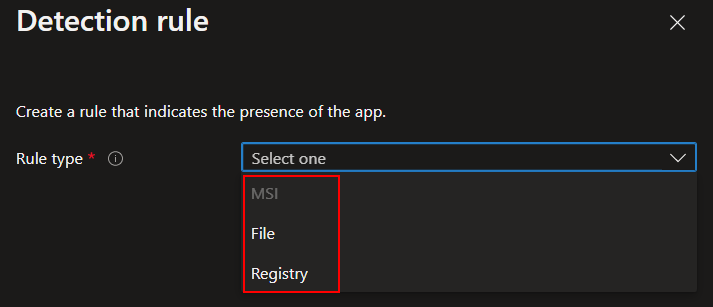 - The built-in rule types of MSI, File/Folder, and Registry. You can use any combination of these to create detection rules for an MSI product code presence, if a file/folder exists, or if a reg key/value exists. In most cases, you can use these built-in rules to satisfy your app detections.