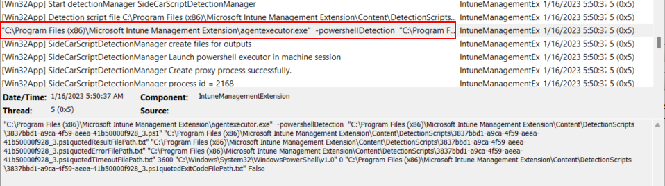 When using a custom detection script, it gets harder to see which rule is failing. Intune is simply using the script as a pass/fail, so if you have multiple rules in your script, but only one is failing, you won’t get details on which rule is failing (not without a little extra work at least). Here is an example where a custom detection script is checking for numerous files, and a few reg entries. I specifically changed the script to look for a file that doesn’t exist for this demonstration. We can see in the IME log the detection script is downloaded to the local machine: