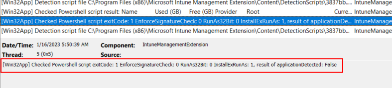 Several entries down, we can see two entries starting with “Checked Powershell Script” where we can get the script output, and the exit code, which dictates if the app was detected or not. The important thing to see here is that we get the PowerShell output from our script, which is “Missing Files or Registry Values” in this example. We can adjust this output so we can get more details on which part is failing: