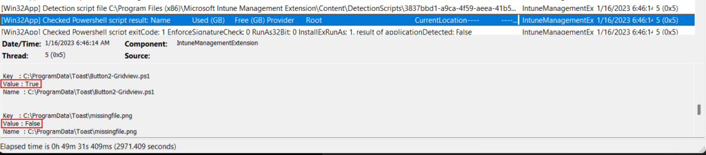 And how the IME displays the results of our custom detection script, showing us details on the detection of our files and registry values: