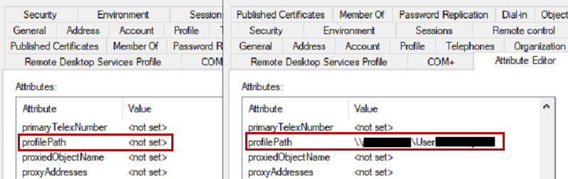 At this point, I still felt like this had to be a permission issue, but the users had the correct permissions to the FSLogix location and the c:\users directory. I started digging into more logs and went through all the steps here –Troubleshoot user profiles with events | Microsoft Learn. But, I still couldn’t find anything pointing to the issue. I kept focusing on the hosts and permissions, but after copying one of the affected user accounts and trying with a new test account, I had the same problem. Because of that, I started comparing AD attributes between the affected users and users who were working properly. That’s when I found the problematic AD attribute, which matched the CentralProfile registry value. We can see in the image below, this value is not set on the left for users who are functioning properly: