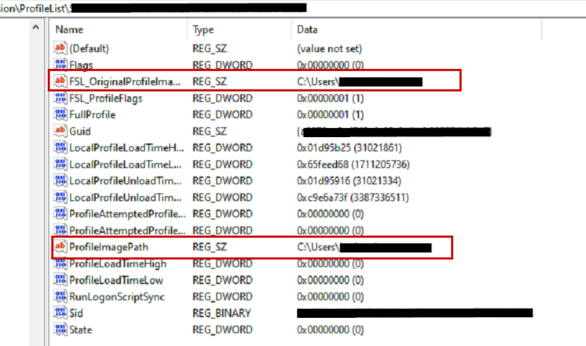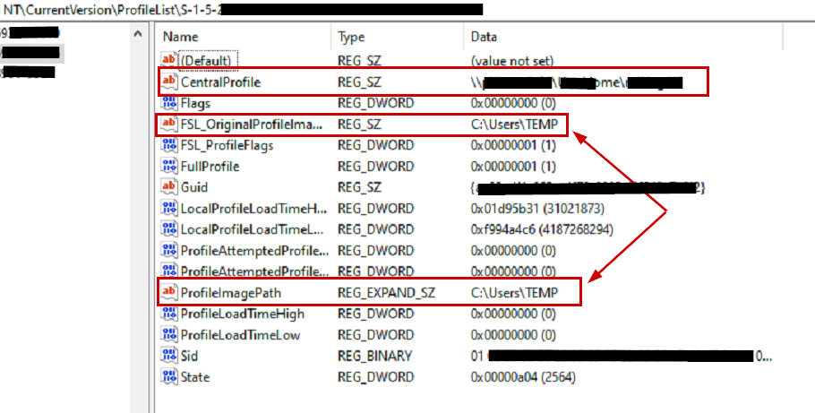 Compared to a user who is functioning fine. We can see there is no value for CentralProfile and their FSL_OriginalProfileImagePath and ProfileImagePath values point to the c:\users location followed by their username. Something seemed fishy that the affected users had a centralprofile value, but I couldn’t determine why (yet):