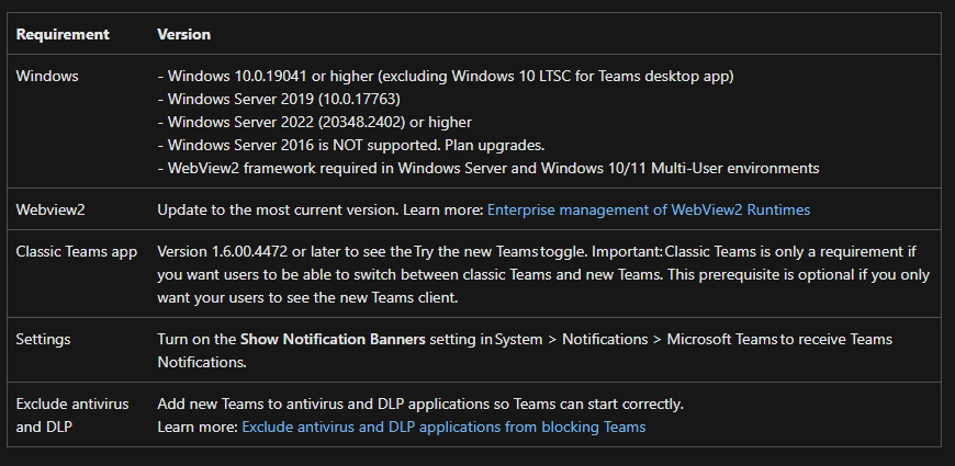 Server 2019 has its own unique way to install the new teams app. You may not have the Edge WebView2 Runtime installed, which is a pre-req for new teams and preinstalled on Windows 11. Let’s quickly look at the pre-reqs for the new teams app: