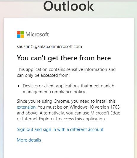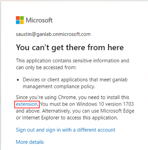 Microsoft does give you a fix right on the block message. The link brings you to where you can download and install the Microsoft Single Sign On – Chrome Web Store (google.com).