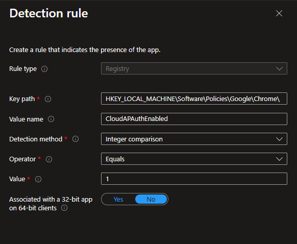 Add your requirements, and for our detection method, we will use a registry rule to see if the reg name and value exist: