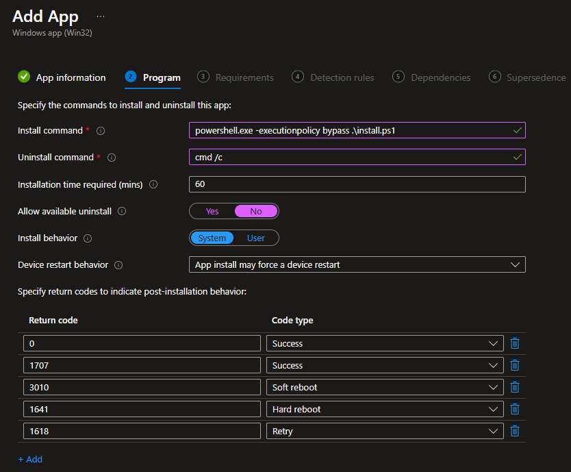 Wrap the install.ps1 file as an Intunewin file, create your app, and use the install command below, where install.ps1 is the name of the Powershell script.