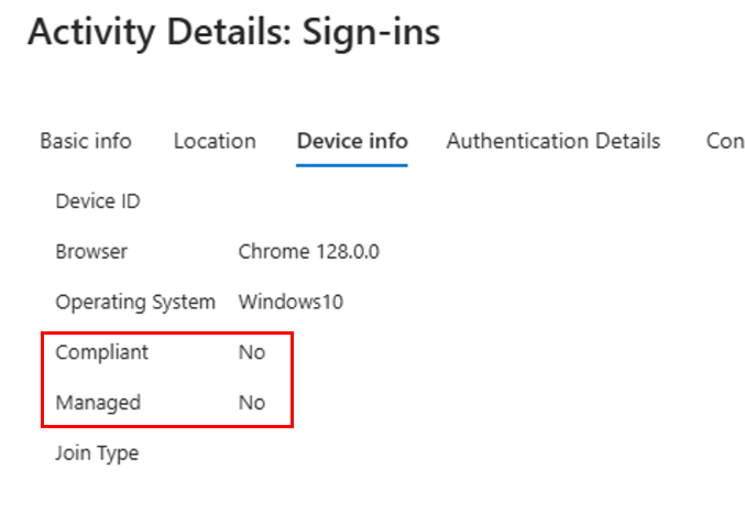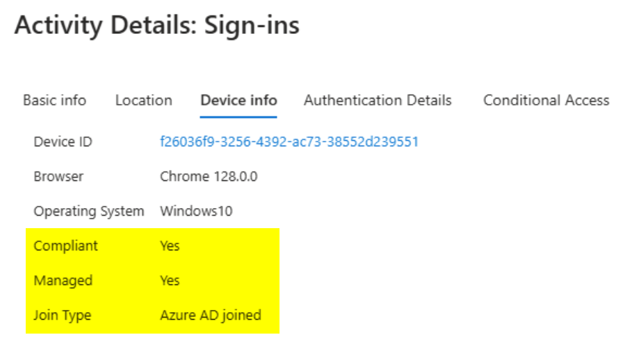 After installing the extension, or adding the reg value, authentications from Chrome will show the device ID, compliance, and Join Type (like in the screenshot below from the sign-in logs). Google’s documentation on this can be found here – Chrome Enterprise Policy List & Management | Documentation. I prefer to use the registry edit instead of the extension since this is built into Chrome and simply needs to be switched on. It’s one less extension to manage/deploy, and adding reg keys using Intune is simple. /